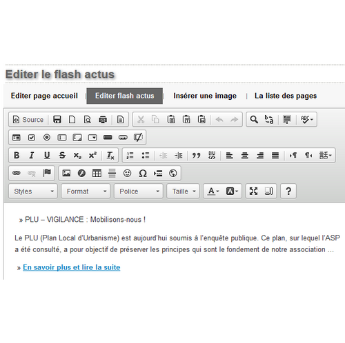 • Une fois le module installé, il est directement accessible dans l'éditeur de la page d'accueil (bouton "Editer Flash Actus").