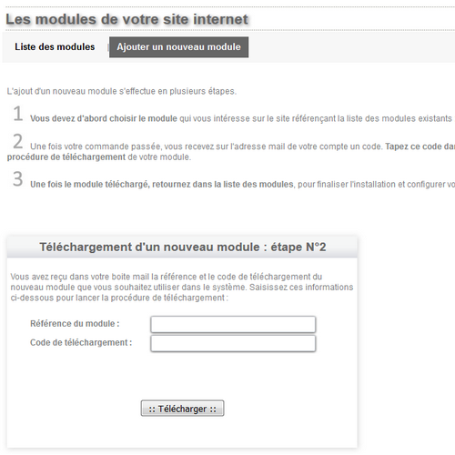 • Dans la rubrique "Configurer le site", choix "Les modules => Ajouter un nouveau module", saisissez la référence et le code de téléchargement.