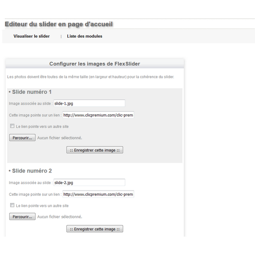 Editeur de slides Flexslider pour page d'accueil de votre site web Clic Premium.